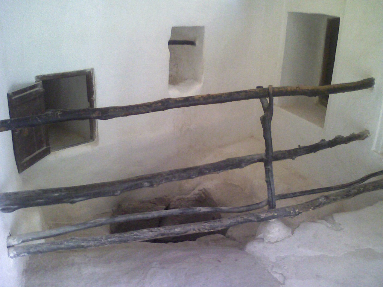 Exploring the grounds further, we came across two big open rooms that looked out over a series of water fountains into the distance towards the mountains. This is where qat was taken and the long room on the left was where Ahmad sat with whichever wife he had the company of whilst the smaller room on the right is where the other three wives had qat. To the right of this was a smaller maids quarter that included a kitchen. There was also a well and cooling hole where bottles of water would be suspended during the summer heat.